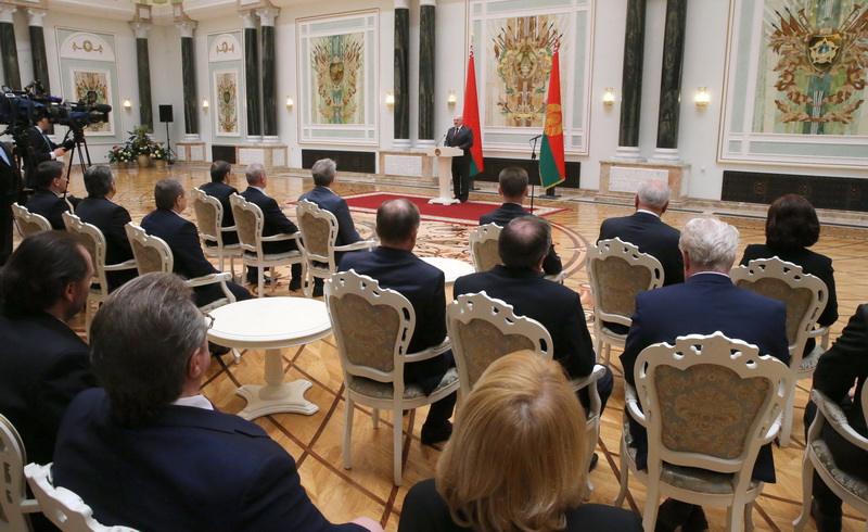 «О трудовых достижениях и вкладе в укрепление нашей страны наглядно свидетельствует присутствие в этом зале большой группы людей, удостоенных высоких государственных наград», – обратил внимание белорусский лидер.