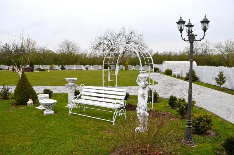 Можно часами прогуливаться по его длинным извилистым дорожкам. Повсюду установлены ажурные кованые качели и скамейки. Приятно вести тихую беседу, рассматривать замысловатые цветочные клумбы и альпийские горки. В теплую пору по утонченным аркам вьются розы. Взгляд невольно останавливается на каждой из многочисленных скульптур. В оформлении парка преобладает белый цвет, из-за чего даже в серую погоду выглядит нарядным. Кажется, что здесь приложил свою руку профессиональный дизайнер. На самом деле хозяева сами все придумали и воплотили в жизнь.