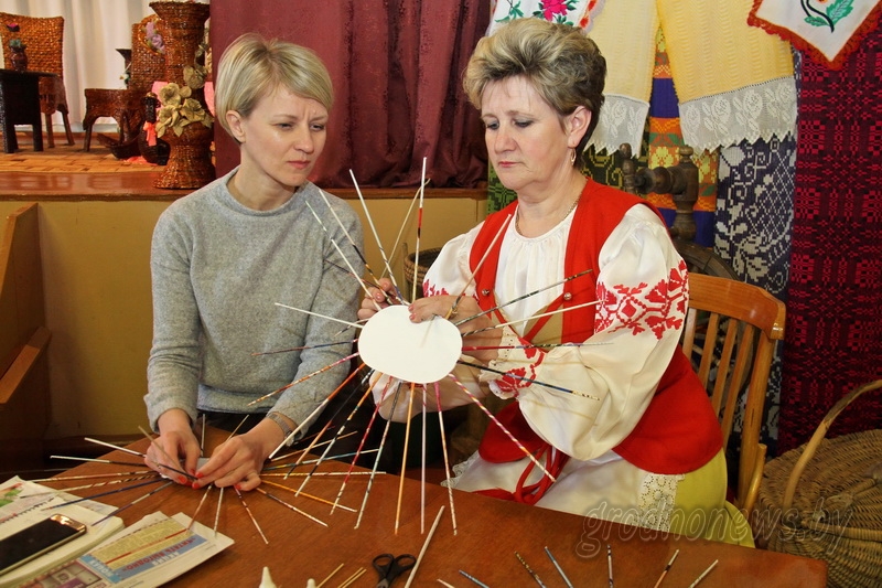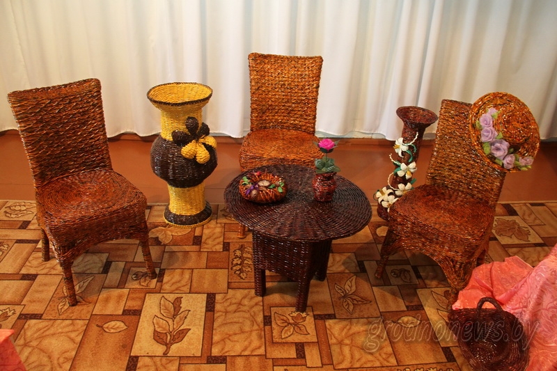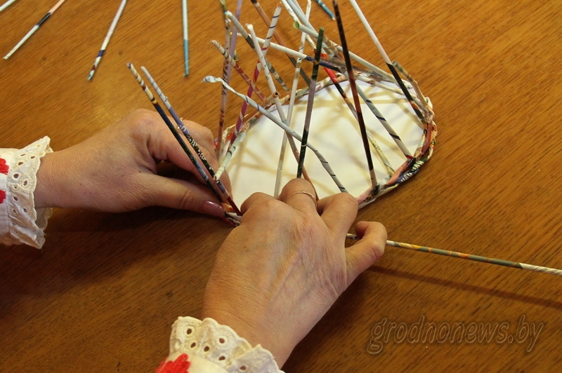 Воспитатель Начского яслей-сада – средней школы Данута Михневич принесла некоторые из своих изделий в местный культурно-краеведческий центр. Мы проверили на прочность стулья и столик, оплетенные газетными трубочками: мебель оказалась крепкая и добротная. Не вызвало сомнения качество корзин для хранения урожая, игрушек, ваз, хлебниц, подносов. Все эти предметы запросто можно использовать в хозяйстве. Для нас Данута Ивановна подготовила мастер-класс по плетению подноса.