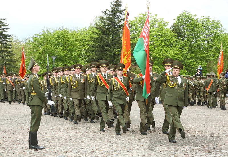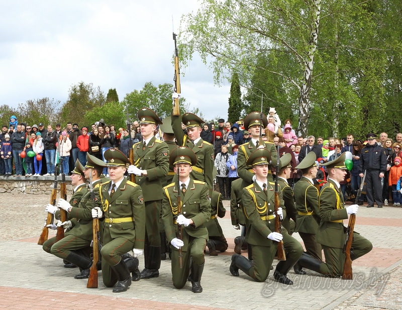 Торжественным маршем прошли войска Гродненского гарнизона. Горожане смогли увидеть показательные выступления войск Западного оперативного командования на территории комплекса «Рубеж имени генерала Карбышева».