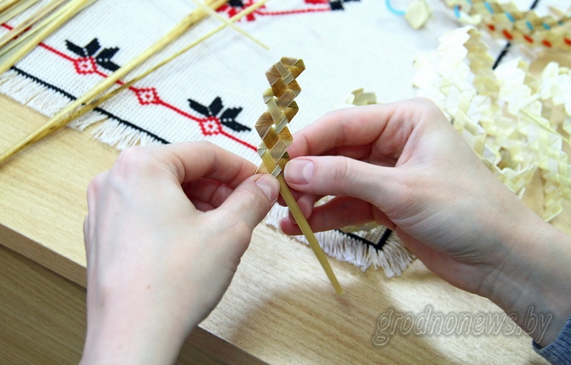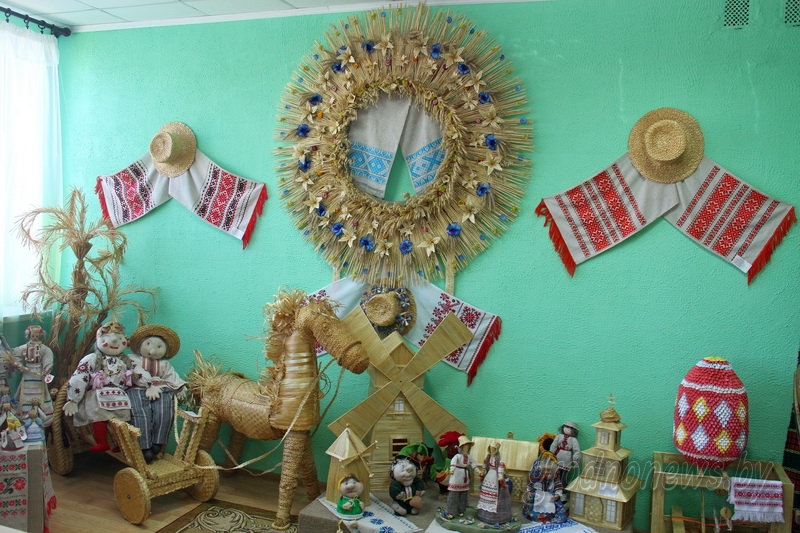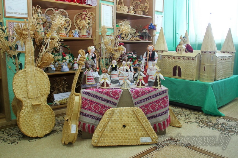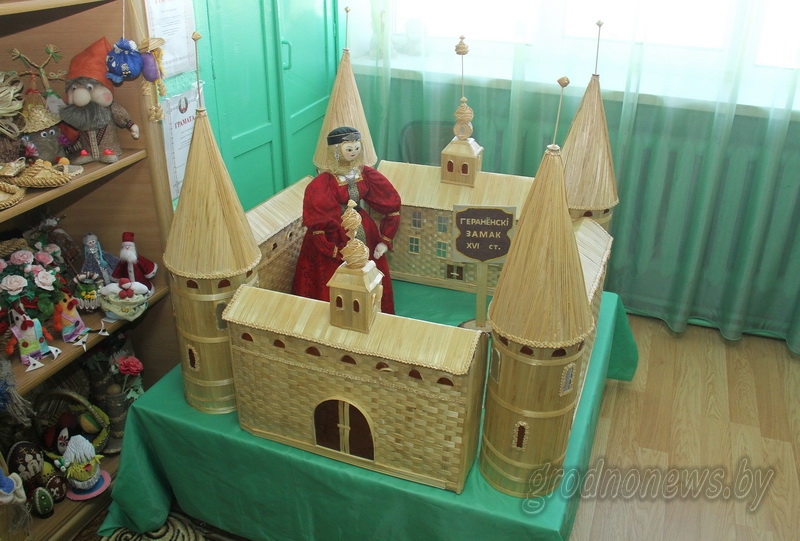 Мы в Гераненах, в мастерской заведующей сектором ремесел и традиционной культуры Зои Старостиной. С порога отмечаем: в помещении солнечно, хотя на улице пасмурная погода. Зоя Эдуардовна – член Белорусского союза мастеров народного творчества – владеет всеми техниками обработки соломы и лучшие экземпляры своей коллекции хранит в этом небольшом помещении. Пшеничный конь, запряженный в соломенную телегу, набор музыкальных инструментов, уменьшенная копия Гераненского замка, куклы, цветы, огромный венок на полстены и такая же необъятная шляпа, под которой от солнечных лучей вполне могут укрыться два или три человека.– Соломоплетение – визитная карточка национальной культуры региона. Нам есть что показать и чем удивить путешественника. Гераненские умелицы создают копии старинных вещей и современные изделия, обязательно сохраняя особенности старинной технологии, – говорит Зоя Старостина.
