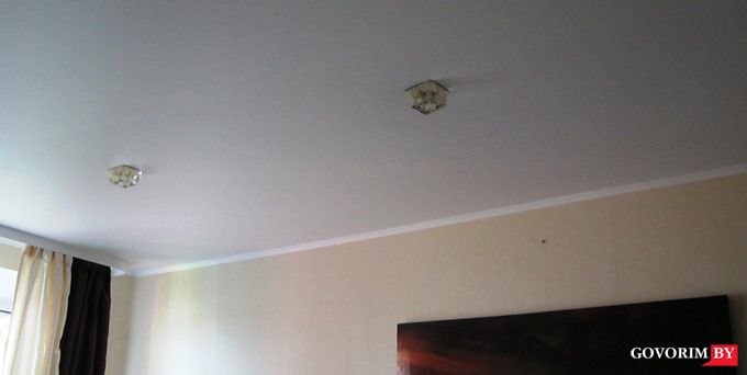 Мы выбрали самый простой вариант: одноуровневый белый матовый потолок. Он, естественно, дешевле многоуровневых изысков, и быстрее делается. Полотно быстро закрепили в профиль-прищепку, установили плинтуса и привинтили светильники.