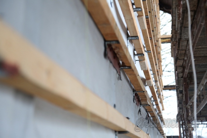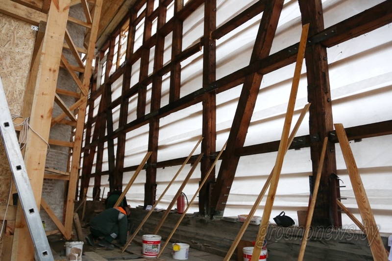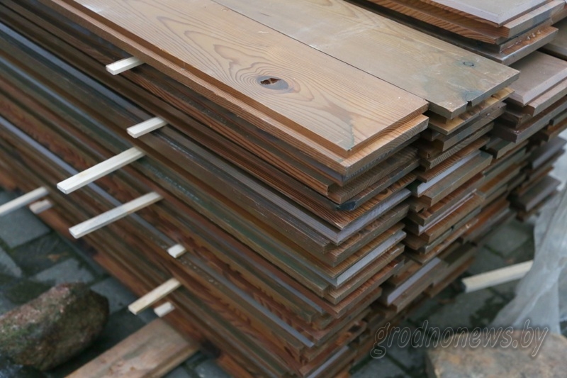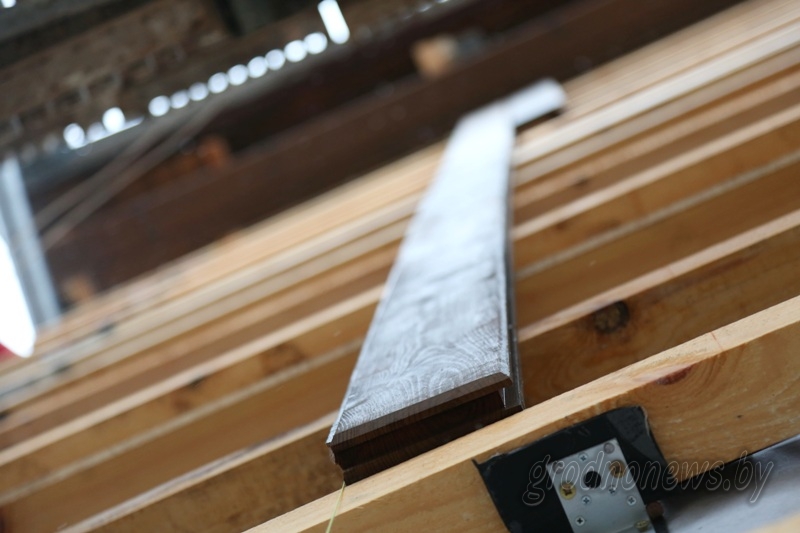 Сегодня около полудня первые три доски были закреплены на южной стене архитектурной жемчужины Гродненщины. Под стать уникальному историческому объекту и его новая «одежда». Она из термомодифицированной белорусской сосны. Обработана таким образом, что перепады температуры, воздействие ультрафиолета и влаги ей нипочем.