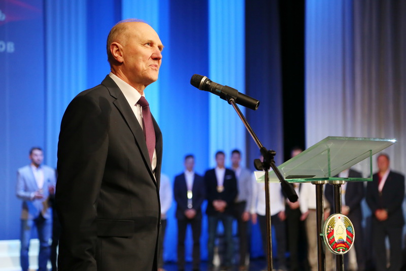 Чествование хоккеистов продолжилось в большом зале драмтеатра. Председатель облисполкома Владимир Кравцов зачитал поздравление Президента Беларуси. В нем говорится, что это достижение – результат серьезной работы не только спортсменов, но и всех специалистов и тренеров, обеспечивавших необходимые условия для успешного выступления команды.