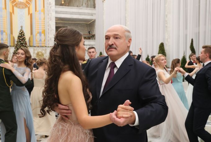 Президент Беларуси Александр Лукашенко сегодня на первом Республиканском новогоднем балу для молодежи во Дворце Независимости танцевал вальс с "Мисс Беларусь - 2018" Марией Василевич.
