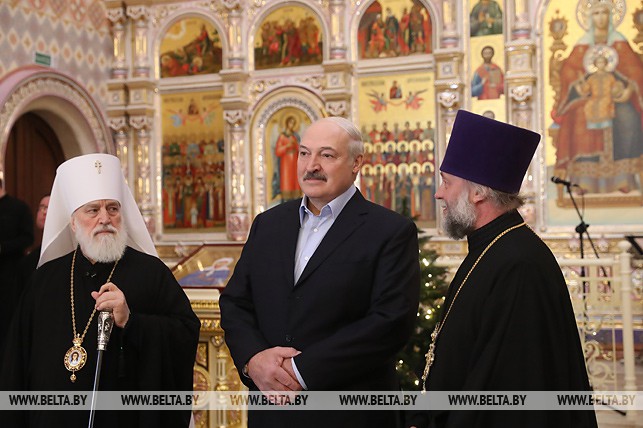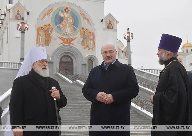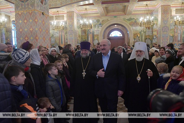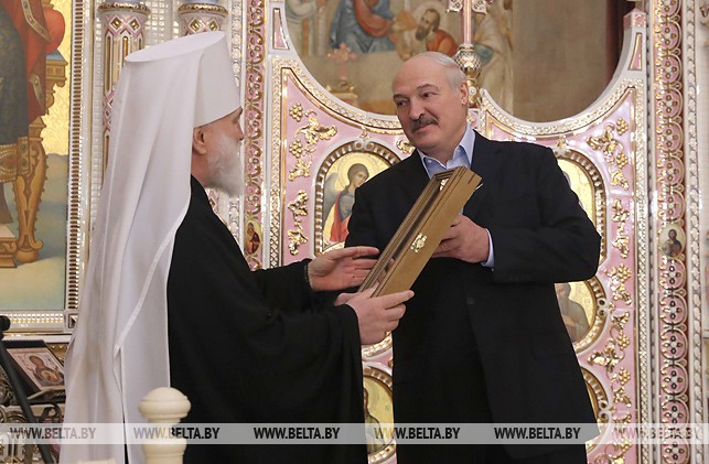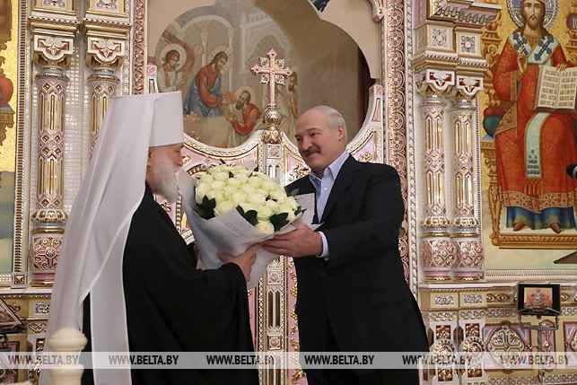 У церкви главу государства встретили Патриарший Экзарх всея Беларуси, Митрополит Минский и Заславский Павел, протоиерей Федор Повный, Уполномоченный по делам религий и национальностей Леонид Гуляко и мэр столицы Анатолий Сивак.