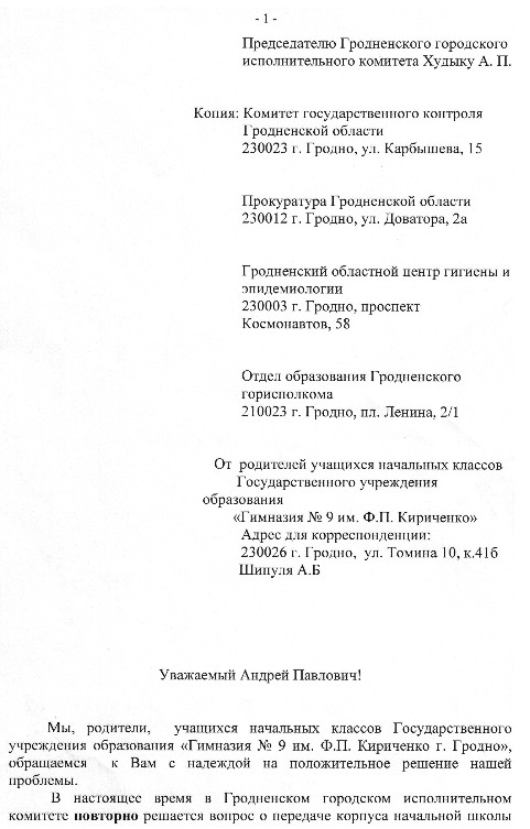 В своем заявлении на имя председателя Гродненского горисполкома родители говорят о том, что все это делалось в надежде на то, что дети смогут воспользоваться всем этим на протяжении всего периода обучения в начальной школе.