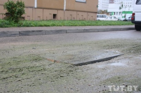 “Нанотехнологии” в действии: яму во дворе на Советских пограничников в Гродно сначала заложили травой, а потом фанерой