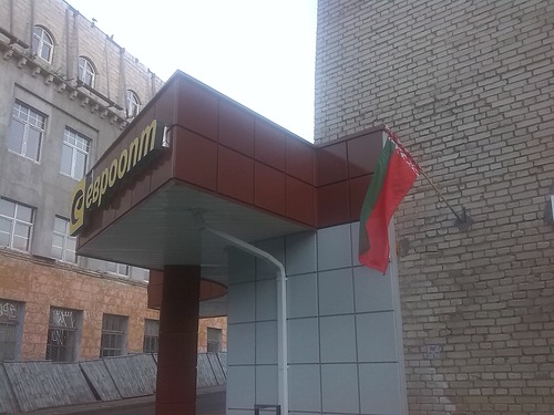 Хотите узнать больше? Магазин “Евроопт” на улице Свердлова в Гродно поздравляет покупателей с Днем Независимости при помощи перевернутого государственного флага. Фото