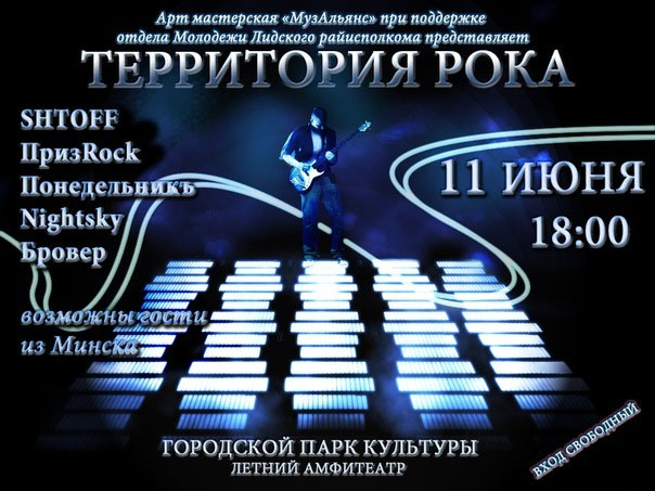 11 июня в городском парке культуры и отдыха на новой сцене пройдет концерт "Территория рока". Участие в нем примут группы: "SHTOFF" (Гродно), "ПризROCK" (Барановичи), "Понедельникъ" (Лида), "Бровер" (Лида), "The Night Sky" (Лида). Возможны также гости из Минска. Вход свободный. Начало концерта в 18.00.