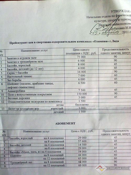 "LL" уже сообщало о том, что с 15 августа спорткомплекс "Олимпия" заработал в полную меру. Также был опубликован и список цен на оказываемые услуги. Однако, как оказалось после данный список был предварительным, и стоимость некоторых платных услуг претерпела изменения. Теперь же мы публикуем более подробный и правильный прейскурант на платные услуги в "Олимпии".