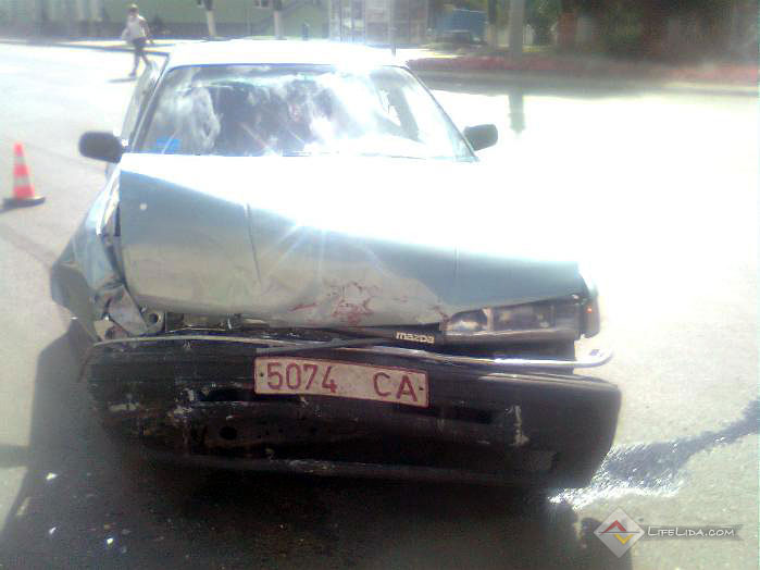 Сегодня днем на перекрестке улиц Советская и Мицкевича произошло дорожно-транспортное происшествие с участием автомобилей "Фольксваген-Пассат" и "Мазды". "Пассат" двигался по улице Советской со стороны ЖБИ и, не убедившись в безопасности движения, совершал поворот налево в сторону озера. В это же время по Советской со стороны Архистратиго-Михайловского собора ехала "Мазда", которая и врезалась в "Фольксваген".