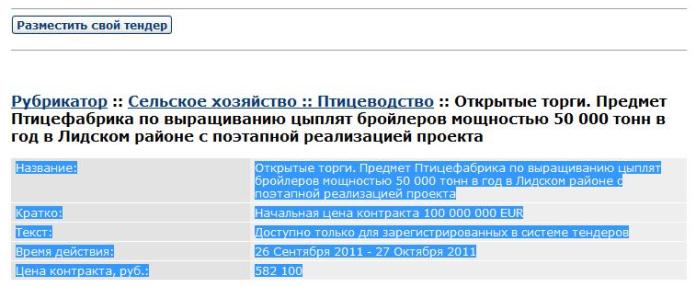 Не ручаясь за правдоподобность нижеизложенной информации, просто констатирую факт. Бродя по просторам Интернета, на сайте www.businesspartner.ru удалось обнаружить следующее объявление: "Название: Открытые торги. Предмет: Птицефабрика по выращиванию цыплят бройлеров мощностью 50 000 тонн в год в Лидском районе с поэтапной реализацией проекта. Кратко: Начальная цена контракта 100 000 000 EUR. Текст: Доступно только для зарегистрированных в системе тендеров. Время действия: 26 Сентября 2011 - 27 Октября 2011. Цена контракта, руб.: