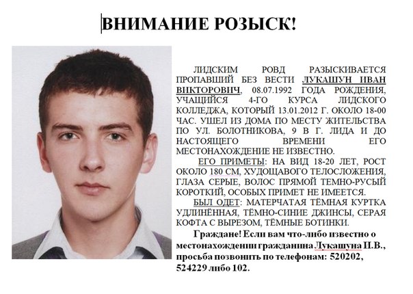 В Лиде без вести пропал 19-летний юноша Иван Лукашун, учащийся четвертого курса Лидского колледжа. Как утверждают его друзья, парень 13 января, в пятницу, находится в клубе "Prospekt". В эти дни не только сотрудники милиции активно ищут пропавшего юношу, но и его друзья, однокурсники, знакомые. В городе появились объявления с приметами и фото Ивана, эти данные также активно рассылаются в социальных сетях. Если кто-то владеет информацией о нахождении парня или какие-то сведения о его исчезновении, просьба не оставаться равнодушными. Телефоны, куда необходимо обратиться, а также фотография и приметы пропавшего лидчанина смотрите в полной новости.