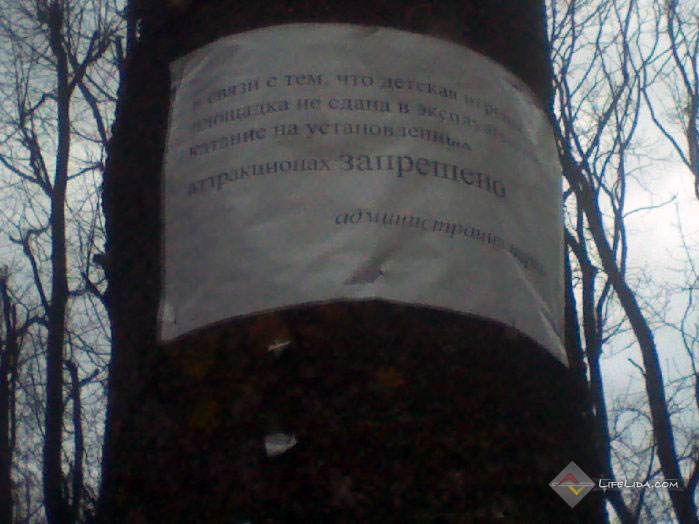 На дереве была приклеена бумага со следующим текстом: "В связи с тем, что детская игровая площадка не сдана в эксплуатацию, катание на установленных аттракционах ЗАПРЕЩЕНО". Полтора года, получается, прошло, когда аттракционы установили, а вот кататься все это время, оказывается было нельзя. И нельзя до сих пор. Видимо, необходимо для этого приложить фантистические усилия.