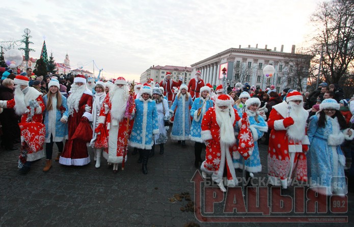 Когда елка зажглась на Советской площади, этот кортеж в сопровождении духового оркестра «Гарадзенскія трубы» и Дедов Морозов со Снегурочками отправился на площадь Ленина. Сюда на лимузине подъехал Санта Клаус. Зарубежный «коллега» гродненского Деда Мороза принял участие в новогоднем представлении и церемонии включения праздничной иллюминации. Положено начало обширной предновогодней программе.
