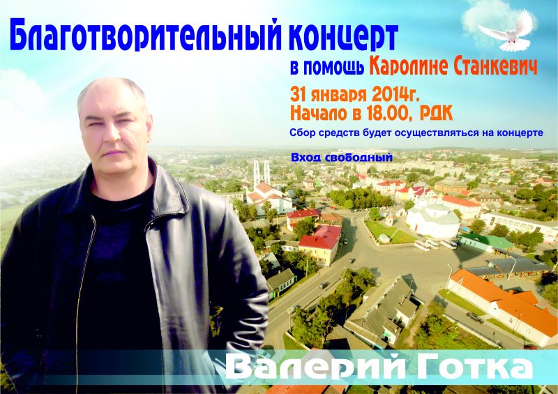 В рамках акции 31 января в 18.00 в районном Доме культуры состоится благотворительный концерт автора и исполнителя Валерия Готка. Посетить концерт вы сможете без билета, оставив в специальном ящике, установленном у входа в зал, пожертвование на лечение Каролины. Собранные средства будут переданы родным девочки после завершения концертной программы.