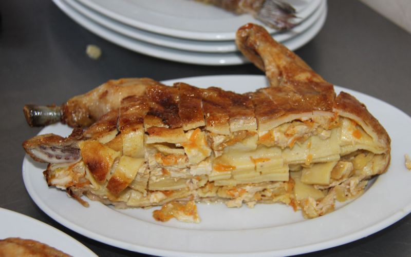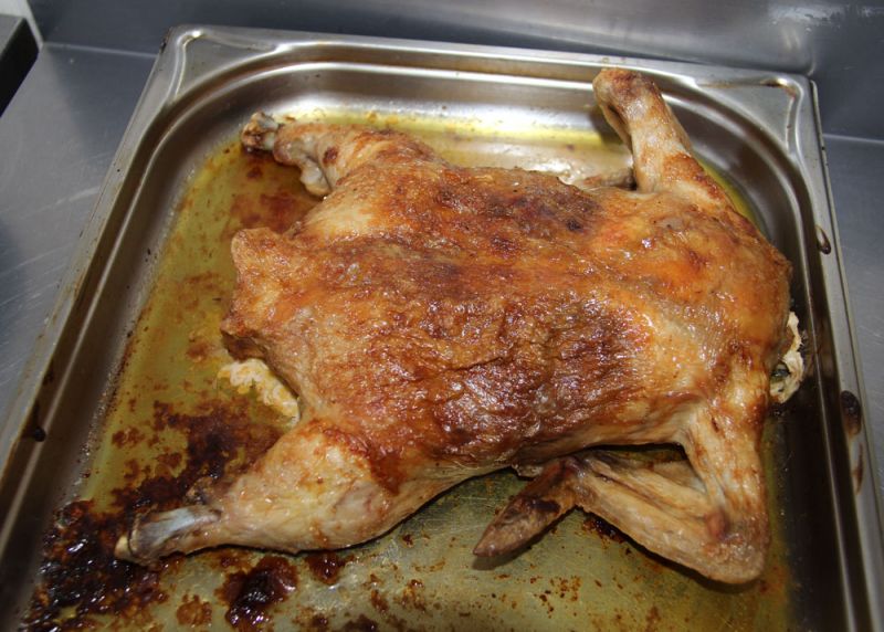 Прежде, чем подавать к столу, готовую курицу освободить от зубочисток, разрезать. Курица, фаршированная блинами, готова!