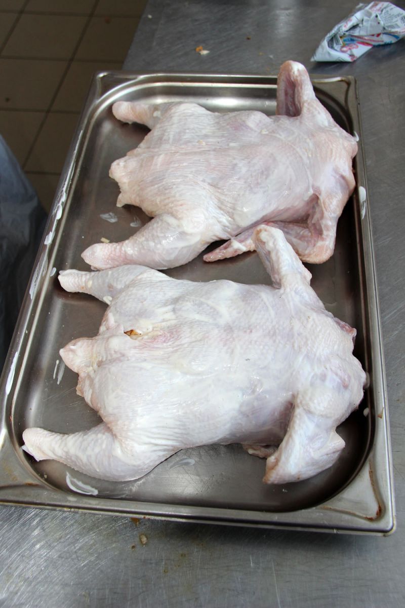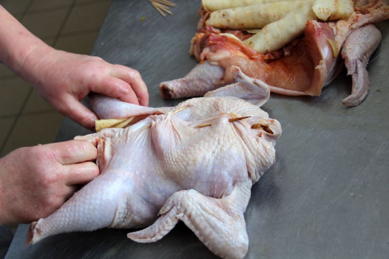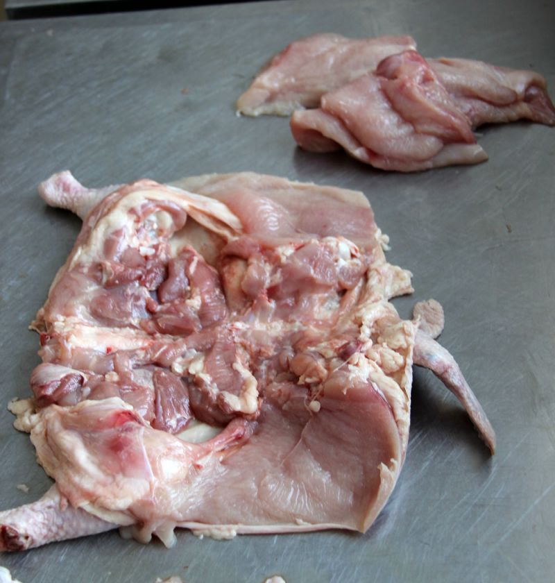Курицу тщательно промыть водой, обсушить, отделить мякоть от кости таким образом, чтобы кости остались только в крылышках и ножках.Отделить грудки.
