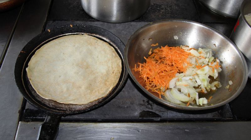Ингредиенты: курица (тушка) – 1 шт., тонкие блины на молоке – 5-6 шт., лук репчатый – 1-2 шт., морковь – 1-2 шт., сыр твердых сортов – 50-80 г, сливочное масло – 1-2 ст.л., майонез (сметана) – 1-2 ст.л., соль, перец чеснок, зубчика, зелень укропа – по вкусу.