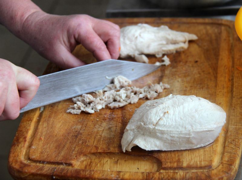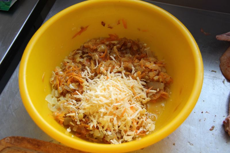 Отделенную куриную грудку отварить до полуготовности, нарезать мясо полосками или мелкими кубиками, смешать с пассерованным луком, морковью, добавить тертый сыр и несколько ложек бульона, по желанию – обжаренные грибы и грецкие орехи.