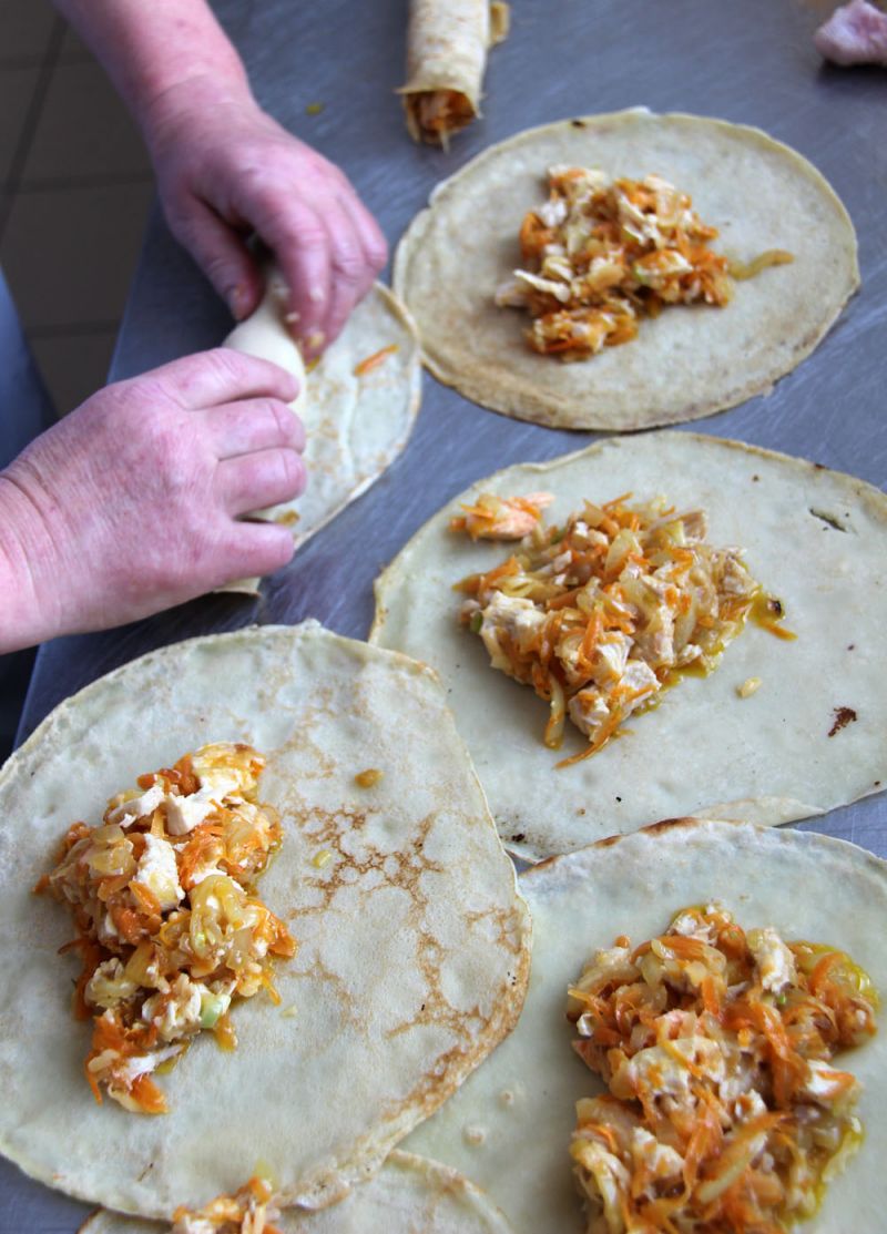 Испеченные тонкие блины равномерно смазать подготовленной начинкой, аккуратно свернуть блинчик трубочкой.