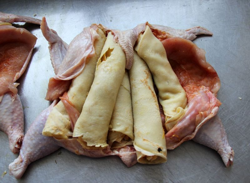 Достать из холодильника курицу и нафаршировать ее подготовленными блинами. Скрепить кожу зубочистками, смазать верх курицы майонезом. Запекать в духовке 40 минут при температуре 380оС.