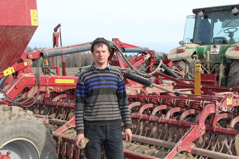 Намеснік старшыні па раслінаводстве Сяргей Міхайлавіч Канюк накіраваў нас на першы ўчастак, да аднаго з найбольш паспяховых сваіх працаўнікоў. На ўскрайку поля ля вёскі Скілондзішкі мы сустрэліся з механізатарам Дзмітрыем Алегавічам Радзевічам. Ён аддана працуе на ніве сельскай гаспадаркі з 2000 года. Штодзень гэты вадзіцель магутнага трактара John Deere-8430 з прычэпным агрэгатам АПП-6Д засявае 35 – 40 гектараў ворыва пшаніцай. Прыкладам, на гэтым полі плошчай 55 гектараў ён скончыў сяўбу за паўтара дня. На пытанне, ці добрасумленны ён спецыяліст, намеснік старшыні адказвае станоўча і зазначае: “Абы-каму такую тэхніку проста не даверылі б”. Яно і сапраўды так – пасяўных агрэгатаў у СВК усяго тры. Ад пачатку пасяўноў кампаніі Дзмітрый Алегавіч пакінуў за сабой ужо больш за трыста гектараў засеяных плошчаў.