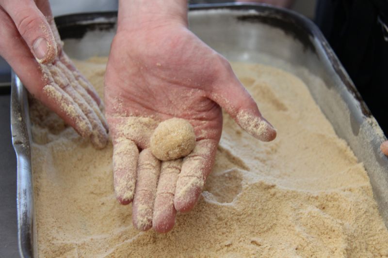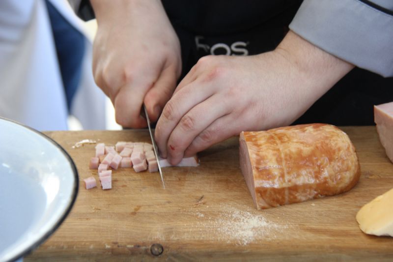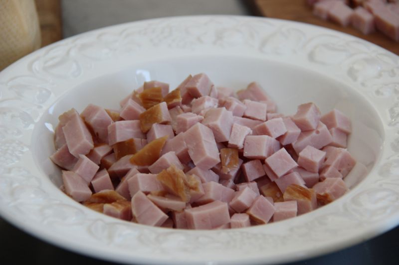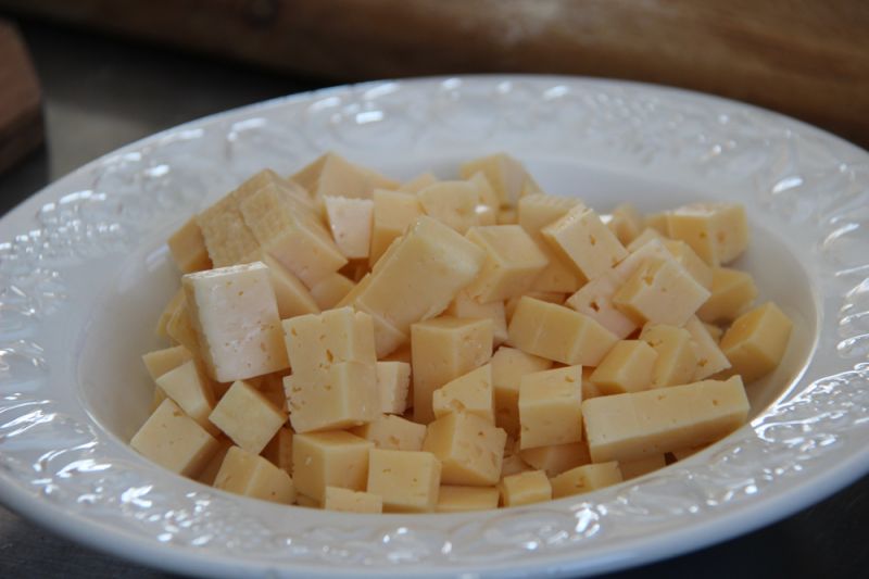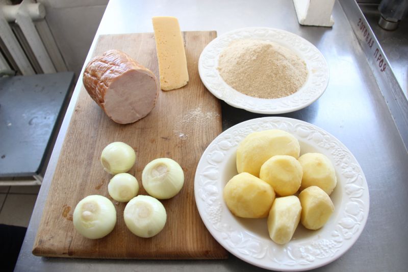 Cостав: картофель – 6 штук, одна луковица, ветчина, сыр, порезанные небольшими кубиками, сухари панировочные, растительное масло, соль.