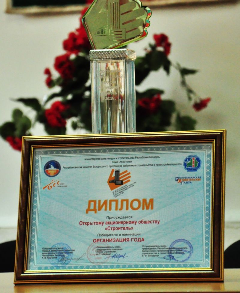 9 апреля 2014 года подведены итоги X республиканского конкурса «На лучшее достижение в строительной отрасли Республики Беларусь за 2013 год». Всего в юбилейном соревновании участвовало 127 организаций республики в номинациях «Организация года», «Руководитель года», «Объект года», «Экспортер года», «Технология года», «Энергосбережение», «Продукт года», «Развитие регионов малых и средних городских поселений». Поздравление победителей и лауреатов конкурса в торжественной обстановке прошло в Минском государственном дворце детей и молодежи. Директору ОАО «Строитель» Александру Алексеевичу Сазановичу был вручен диплом победителя в номинации «Организация года». При подведении итогов оценивались такие показатели, как уровень рентабельности, производительность труда, несчастные случаи, наличие системы менеджмента качества ИСО-9000, работа по повышению профессионального уровня работников, качество строительно-монтажных работ за 2013 год. Благодаря коллективу ОАО «Строитель», каждому его работнику достигнуты высокие показатели в строительстве, что по достоинству было оценено на республиканском конкурсе.