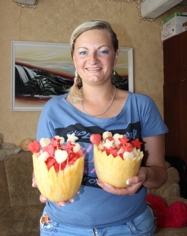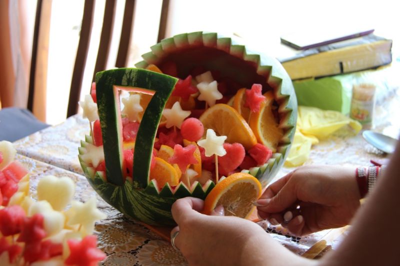В арсенале Валентины добрый десяток различных инструментов – ножиков всевозможной формы и конфигурации. Именно они помогают воплощать в жизнь все кулинарные идеи и получать затейливые узоры, бесподобные «мясные розочки», цветы из овощей. Гости радушной хозяйки нередко удивляются, неужели весь этот дизайн съедобный, настолько он напоминает произведения искусства. Правда, и времени они отнимают много. На вырезание детской коляски из арбуза, за которым нам удалось наблюдать, даже у Валентины, серьезно поднаторевшей в карвинге, уходит около двух часов. А это только один элемент праздничного стола. Можно представить, сколько приходится колдовать над украшением всех блюд.