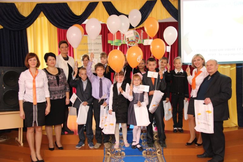 Напрыканцы ўрока пяцікласнікі ўручылі ў падарунак першакласнікам паветраныя шарыкі з сімволікай банка, каб тыя ведалі, што ў гасцях школы былі прадстаўнікі “Белаграпрамбанка”. Бо фінансавая адукаванасць — упэўненнасць у сваёй будучыні.