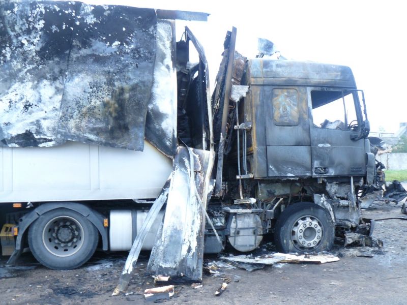 Пожар ликвидирован спасателями в 02.03. В результате огнем уничтожены кабины автомобилей VOLVO FH и DAF 105405 FX, повреждены обшивки рефрижераторов, 1,5 т мясной продукции. Как пояснили в управлении, владелец и грузоотправитель автопоездов зарегистрированы в Калининграде (РФ), в каждом рефрижераторе находилось по 20 т мясной продукции. Повреждено также лакокрасочное покрытие кабины еще одного автомобиля DAF FX 95, который был задержан до решения суда о конфискации.