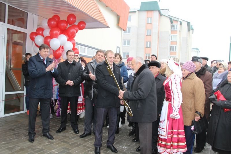Со значимым событием жителей микрорайона поздравил председатель райисполкома Мирослав Саросек, а подрядчик, директор ОАО «Строитель» Александр Сазанович вручил символический ключ председателю правления Ошмянского филиала Гродненского облпотребобщества Владимиру Конюху.