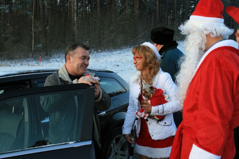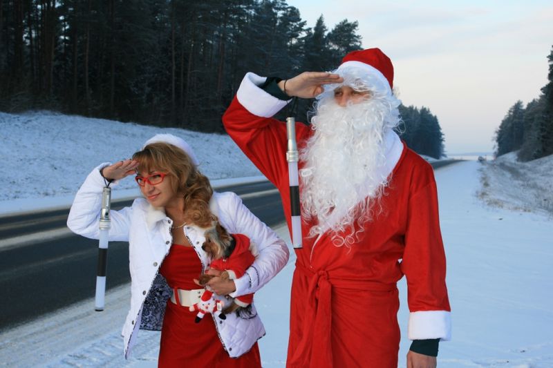 В канун Нового года хочется самим порадоваться от души и для других сделать что-нибудь приятное. Это время щедро на выдумку. По сути, сам факт поздравления ценен как раз приятными неожиданностями: не ждал поздравления, а тебя поздравили – с распахнутой для радости душой и от чистого сердца. И ответная реакция незамедлительно последует – радость имеет свойство передаваться и множиться. Именно с желанием приумножить радость в предпраздничные дни устроили на дороге Минск-Вильнюс сотрудники регионального отдела контроля на платных дорогах «Ошмяны» целое костюмированное представление. Переодевшись в сказочных персонажей, они останавливали проезжающие автомобили и после добрых слов пожеланий в канун праздника напутствовали побыстрее, без задержки добраться к месту назначения и вручали маленькие сувениры. Проезжающие были все без исключения приятно удивлены. Еще бы! Из лесу к ним на дорогу выходил лось и жезлом просил сделать остановку. Ну, а следом Дед Мороз и Снегурочка брали бразды правления в свои руки и со свойственным им приподнятым настроением сыпали пожелания в адрес водителей, которые, несмотря на то, что уж очень спешили попасть к празднику домой, тем не менее, с удовольствием принимали поздравления. Участником представления на дороге был даже домашний песик Джеки одной из сотрудниц, которого тоже нарядили в костюм Деда Мороза. Без сомнения, доброта, юмор и сердечность поздравлявших навеяли проезжавшим теплые воспоминания о домашнем уюте, к которому в эти дни все спешили с особым нетерпением.