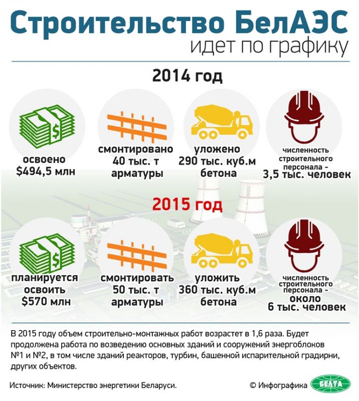 Сооружение БелАЭС осуществляется в полном соответствии с директивным графиком генерального контракта от 18 июля 2012 года. План строительно-монтажных работ на 2014 год выполнен на 100%. В прошлом году смонтировано 40 тыс. т арматуры и уложено 290 тыс. куб.м бетона. Всего с начала строительства смонтировано 49,7 тыс. т арматуры (32,9% от всего объема) и уложено 342,2 тыс. куб.м бетона (31,7%).