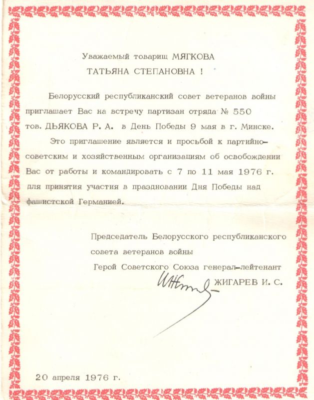 Недавно Татьяна Степановна по приглашению районного совета ветеранов ездила в Минск, в музей истории Великой Отечественной войны. В поездку она взяла с собой фотографию, на которой изображена группа партизан отряда «За Родину!» во главе с комиссаром Алексеем Белогорцевым. Такое же фото размещено на одном из стендов музея. Этот снимок сделан уже после освобождения Белоруссии, в августе 1944 года, во время субботника, на котором молодежь убирает помещения, где расположится музей истории Великой Отечественной войны. В составе тружеников-добровольцев и сестры Татьяны Степановны Галина и Лидия, которые состояли в партизанском отряде до последнего дня его существования. Они помогали обустраивать быт, ухаживали за ранеными, стирали бинты, трудились на кухне.