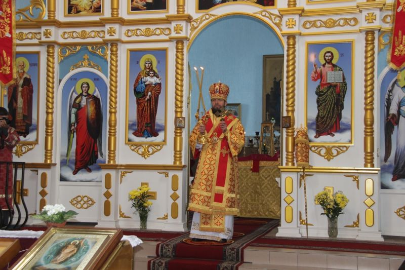 После завершения богослужения, протоирей Петр Петлеха поблагодарил архиепископа Порфирия за совершение Литургиии подарил ему подарок от прихожан храма.