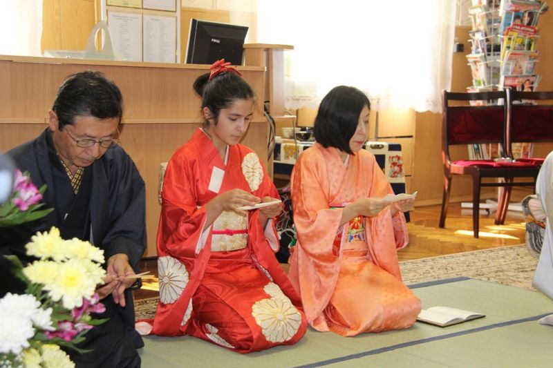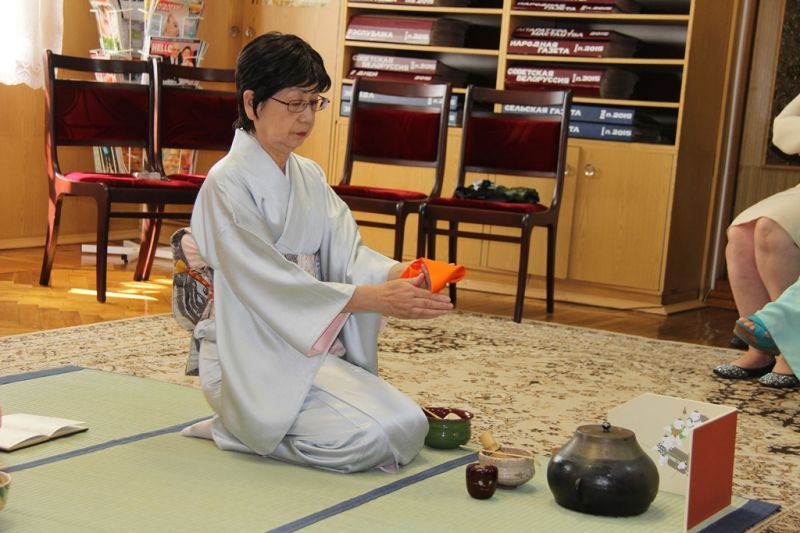 Каб максімальна наблізіць абстаноўку ў чытальнай зале бібліятэкі да той, што адпавядае правілам цырымоніі, госці разаслалі спецыяльны дыван – татамі, які замяняе стол, і падрыхтавалі посуд. Дачка Масака Юйэ паказала японскі танец з веерам. Па ўмовах даўняй японскай традыцыі госці карыстаюцца не вытанчаным бела-сінім фарфорам, які, дарэчы, маецца амаль у кожным доме, а простымі керамічнымі кубачкамі няправільнай формы, што падвяргаюцца штучнаму старэнню. Падбор кубачкаў – цэлая навука. Напрыклад, зімой яны больш закрытыя і грубыя, а ў цёплы сезон – наадварот.
