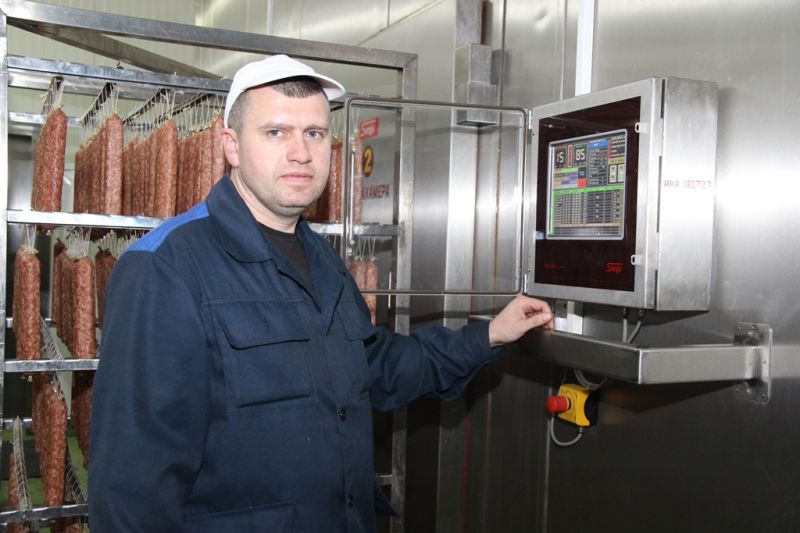 Входим в цех сырокопченых колбас. В цеху аппаратчиком термической обработки продуктов работает Михаил Битель. В этой специальности он трудится восьмой год, а общий стаж работы на мясокомбинате – вдвое больше. В 2012 году в числе лучших тружеников области он был удостоен звания «Человек года Гродненщины».