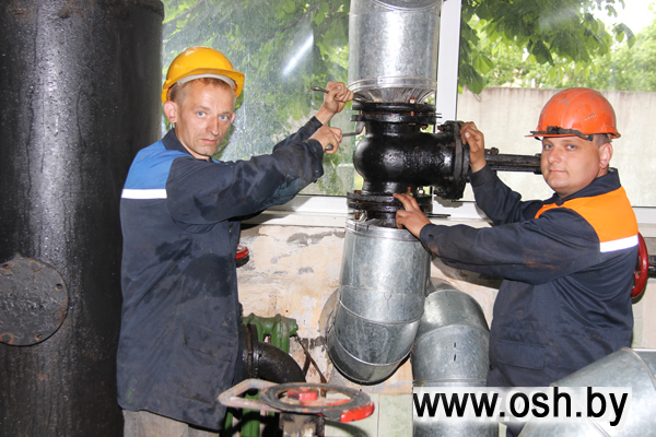НА СНИМКЕ: слесари котельного оборудования Андрей Чепелев и Виктор Янович производят установку заглушек на трубопроводе горячего водоснабжения.