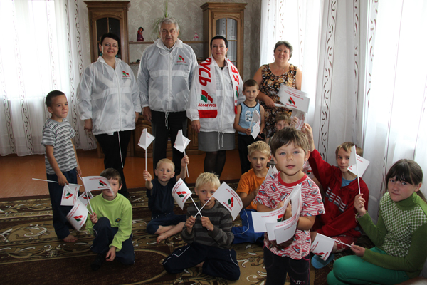 Гостями оказались сотрудники - активисты общественного объединения «Белая Русь» Валерий Михайлович Козлов – председатель организации по производственному принципу РОО «Белая Русь» ОАО «АСБ Беларусбанк», Елена Николаевна Осмоловская – председатель первичной организации РОО «Белая Русь» центрального аппарата ОАО «АСБ Беларусбанк», активисты объединения Наталья Марьяновна Маликова и Евгений Иванович Лебедев. От РОО «Белая Русь» в благотворительной акции участвовали Елена Петровна Петракова – директор центра банковских услуг №418 в г. Ошмяны филиала №423 г. Сморгонь ОАО «Сберегательный банк «Беларусбанк» и ее заместитель Тамара Романовна Суровец.