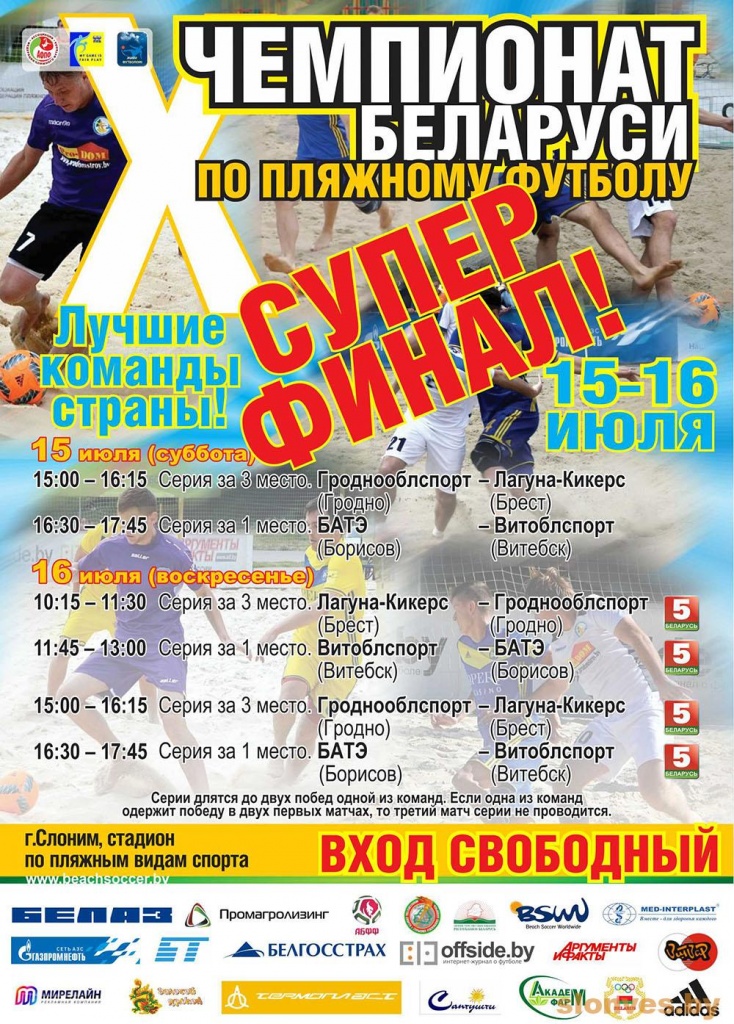 15 июля в Слониме стартовали игры суперфинала чемпионата Беларуси по пляжному футболу. Состязания проходят на стадионе по пляжным видам спорта на Лобазовском озере.