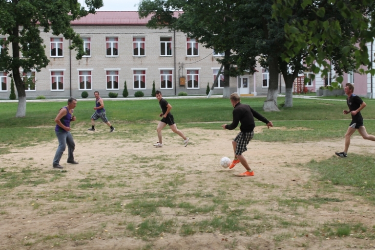 На школьным стадыёне праходзіць матч па міні-футболу паміж камандамі аграгарадкоў.