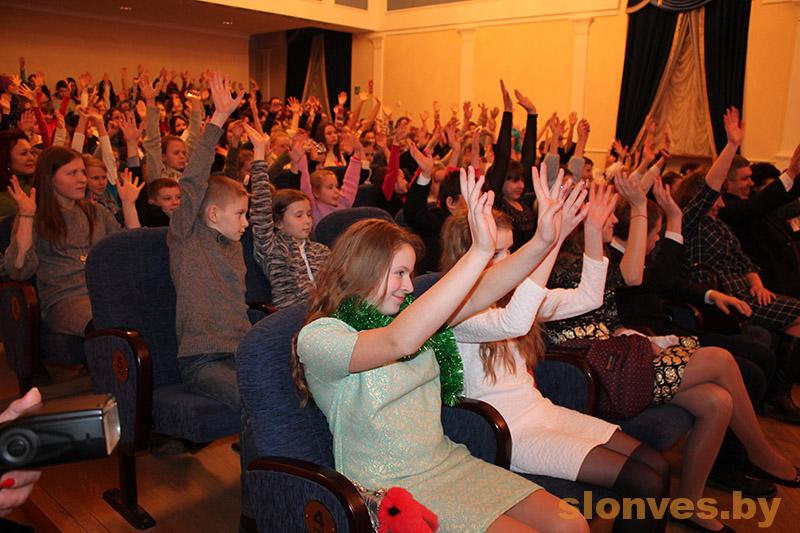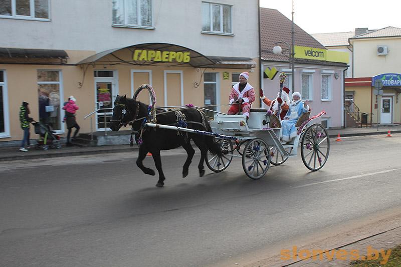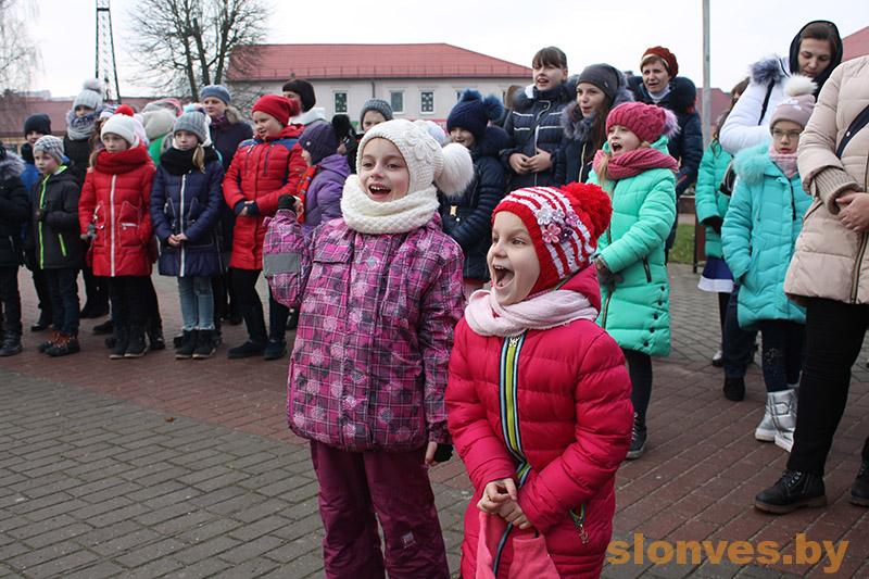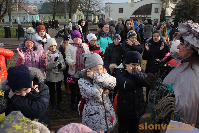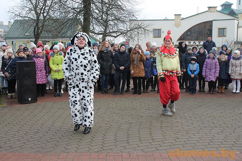 Началось мероприятие на площади Ленина, где сказочные герои веселили детвору, танцевали и играли с ними в различные игры. Немного позже к школьникам на карете прибыли Дед Мороз и Снегурочка, которые пригласили детвору в Слонимский драматический театр.