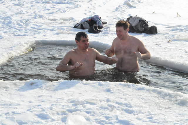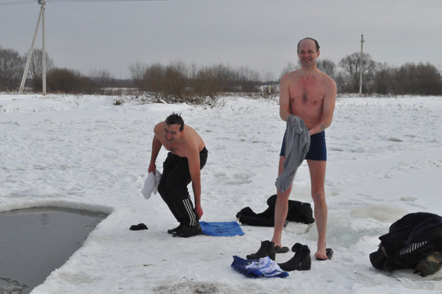 Уже с утра Олег Юреня готовит прорубь для купания. После обеда он и его товарищи отправляются окунаться в ледяную воду. Например, 9 февраля температура воздуха была примерно минус 10. На берегу реки собралось несколько зевак, которые спрашивали у экстремалов: «Как водичка?». Ответ на такой вопрос очевиден.