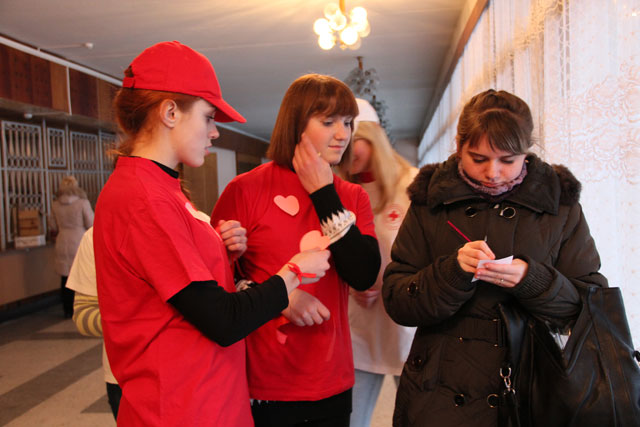 Всем участникам акции на руку повязывали символическую красную ленточку-оберег как свидетельство о том, что они знают о путях передачи ВИЧ.