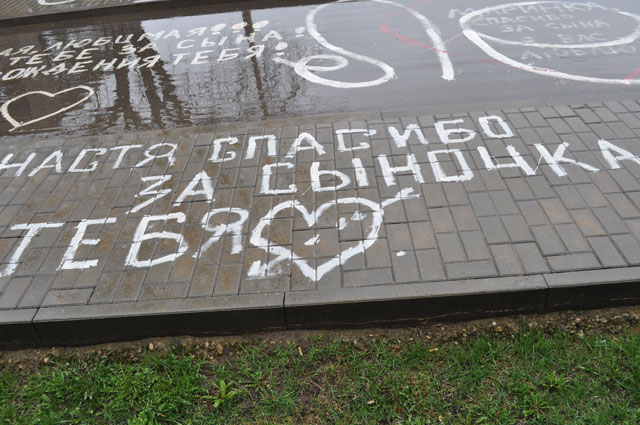 «Настя, спасибо за сыночка! Я тебя люблю» — гласит одна из надписей. Кто-то засвидетельствовал свою радость от двойного праздника: «Зайка, родная, любимая! Спасибо тебе за сына! С днём рождения тебя! Я вас люблю».