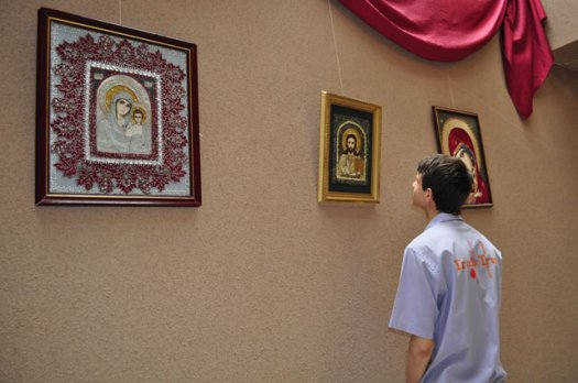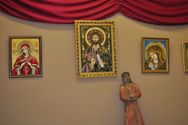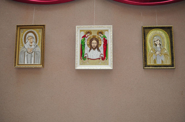 На выставке представлено более 20 работ автора, среди которых находятся как небольшие образы, так и достаточно большие, украшенные бисером и различными камнями.