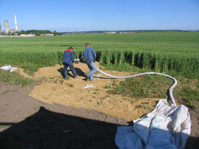 Спустя некоторое время прицеп подняли и вытащили на дорогу, а водителю пришлось зерно собирать с земли при помощи специального шланга.